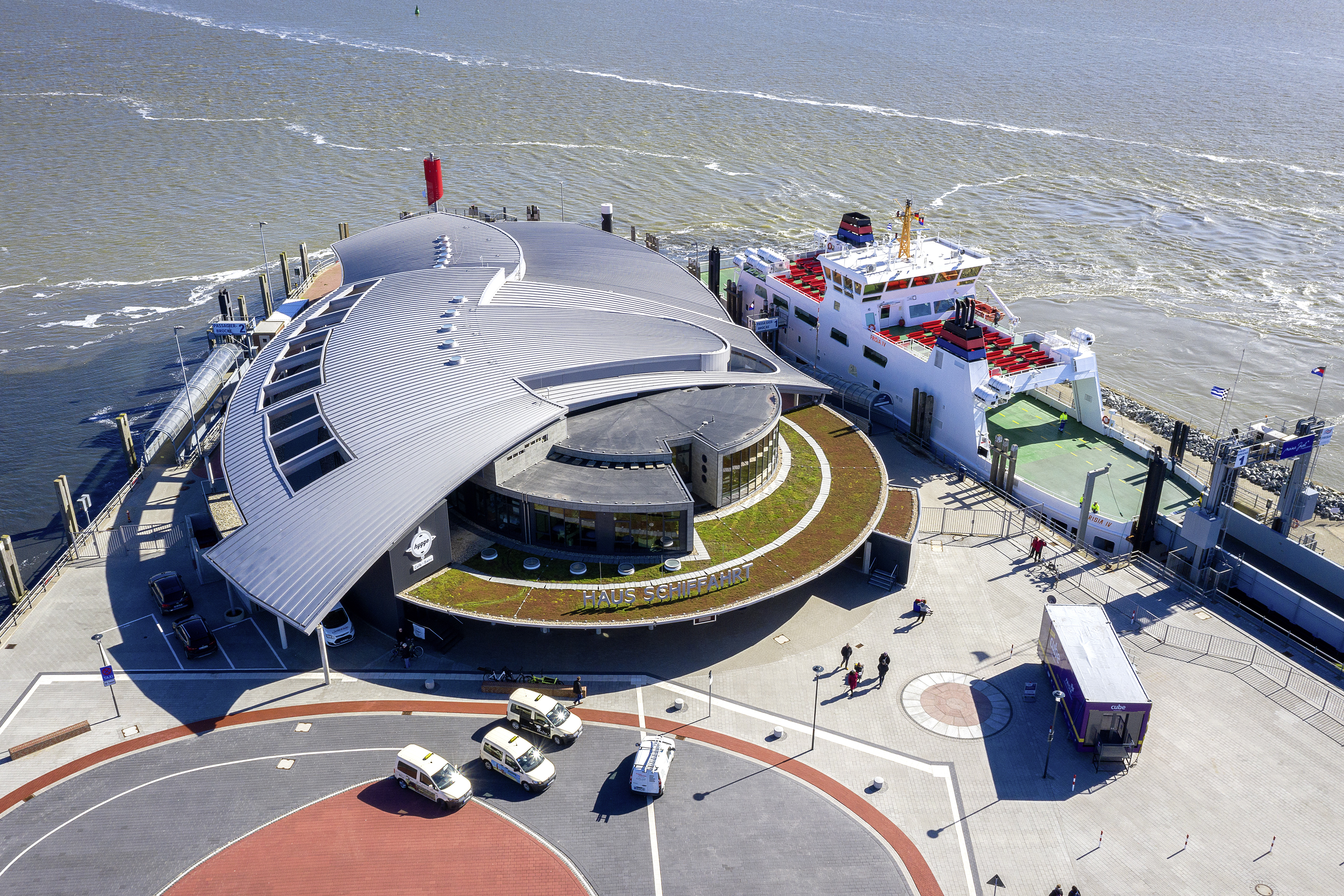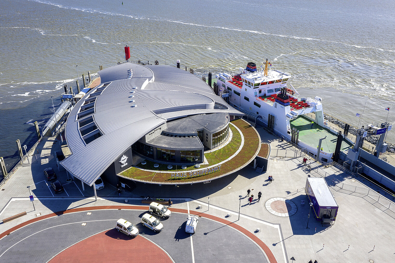 Langs Nordsjøkysten er været svært skiftende. De ca. én million gjester som årlig reiser med ferge fra øya Norderney til Norddeich på fastlandet ble utsatt for vind og vær i lang tid mens de ventet på fergen. Det ønsket rederiet Norden-Frisia å endre på og bygget derfor denne nye havneterminalen.