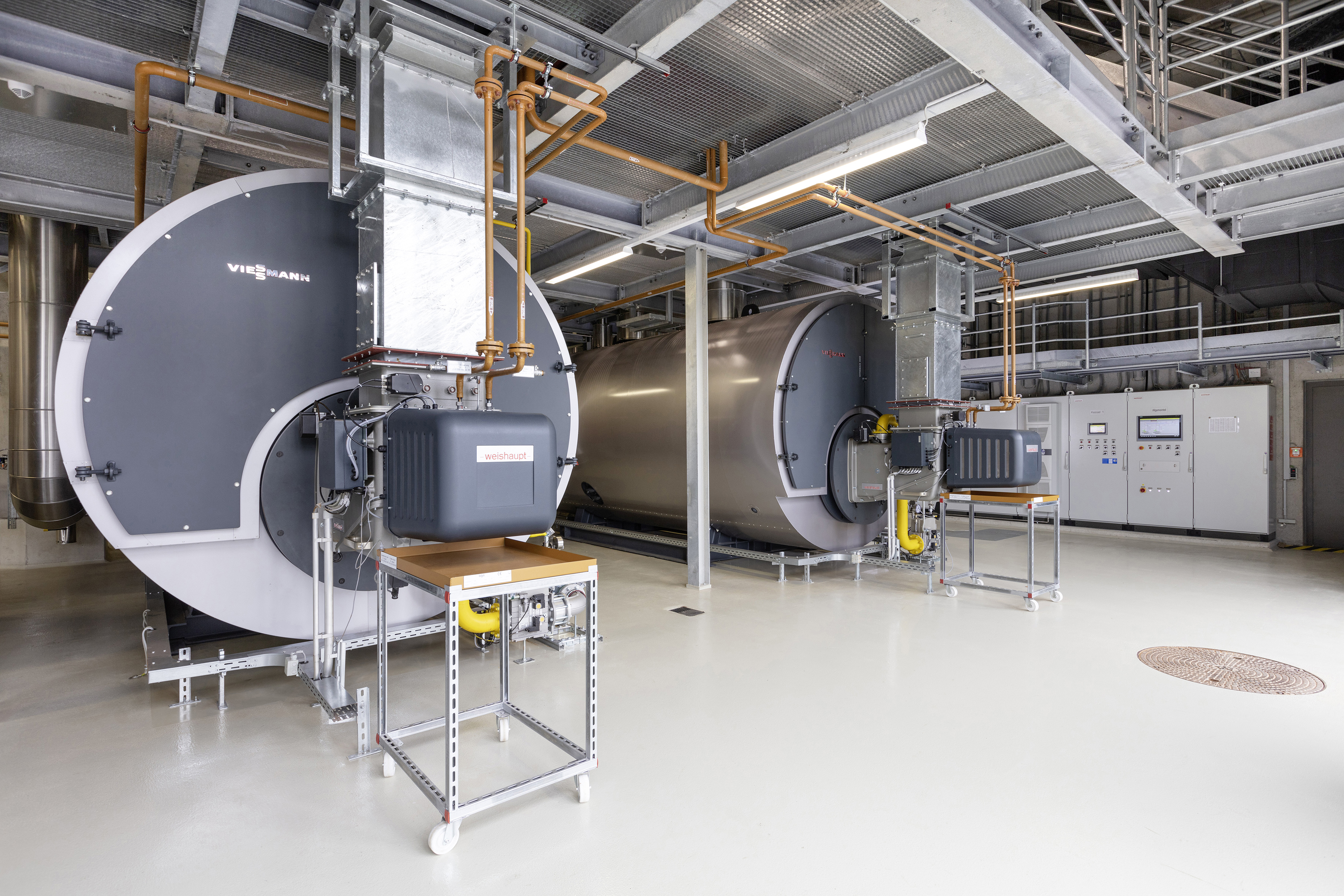 Weishaupts egen kaskadereguleringsløsning brukes i begge kjelanleggene. Det er et patentert hydraulikk- og reguleringskonsept som muliggjør store energibesparelser.
